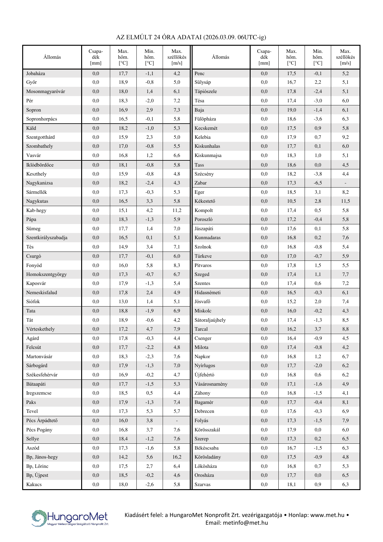 • minimum és maximumhőmérséklet: előző nap 19 CET-től aznap 19 CET-ig,