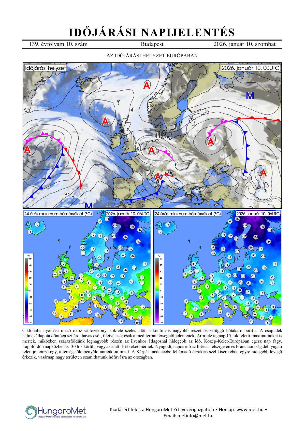 Az európai kitekintés a fronttérkép és a rövid szöveges elemzés mellett bővül a hőmérséklet napi minimum- és maximumértékeit ábrázoló térképekkel.